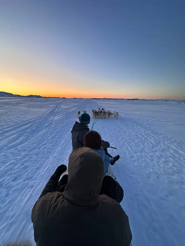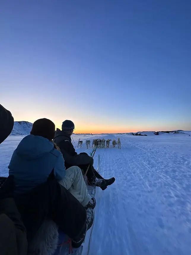 Vi holder en behagelig pause med kaffe eller varm kakao, tid til at tage billeder og selvfølgelig mange hundekram, mens vejen fører ud mod Akinnaq-bjerget. Vi nyder den fredelige rytme, når slæden glider over den tidlige snesne, mens vi efter pausen glider tilbage mod Ilulissat.