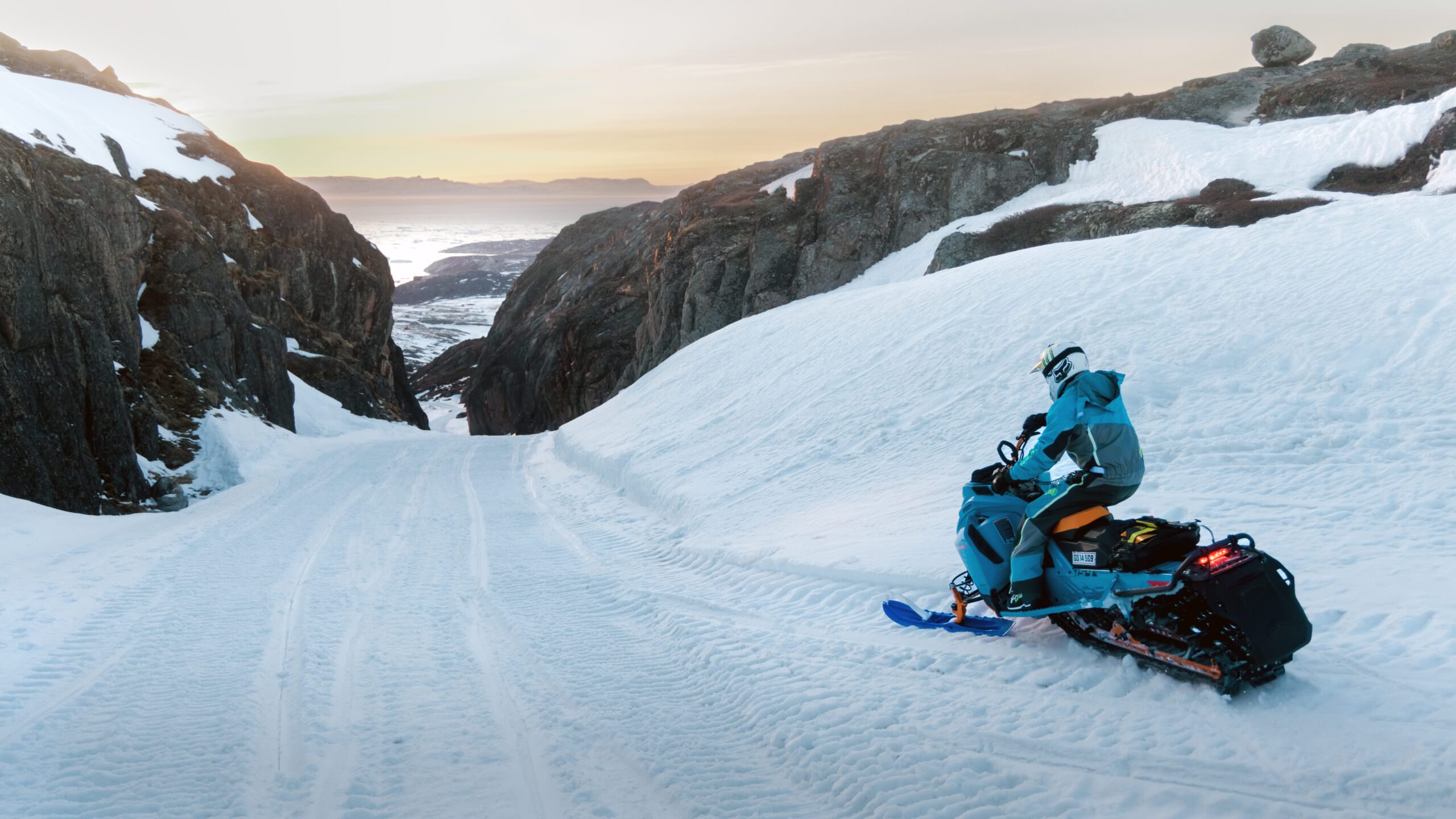 Snescooterkørsel med fjordudsigt