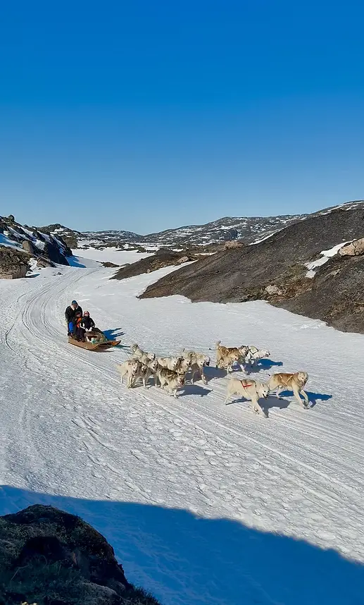 Use the dogsled instead of the snowmobile. Glide across mountains, icy lakes, and picturesque paths with Jørgen, co-owner and five-time Greenlandic Dogsled Champion. Our observations suggest that an hour is more than plenty for visitors; longer sled rides may be uncomfortable.